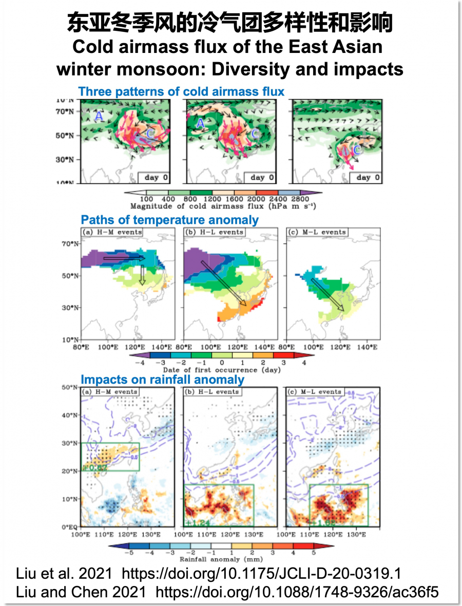 (1)基于冷空气团等熵分析法,考察了与冷空气团活动有关的天气扰动和季节内振荡,揭示冷空气团进退是大气污染消散和恢复的关键机制 (Liu, Chen and Iwasaki 2019 JGRLiu, Chen et al. 2022 ACP)。(2)定量分析了冷空气团的移动演变和物理过程,揭示区域极端低温和破纪录寒潮事件的成因机制 (Yamaguchi et al. 2019 JMSJ; Liu, Liu and Chen 2020 AAS);中高纬冷空气团的向南流动可表征东亚冬季风多样性,并对低纬地区的气温降水产生不同影响 (Liu et al. 2021 JCLILiu, Liu and Chen 2020 AAS)。(3)研究夏季极地冷空气团的长期趋势,揭示其“空调”冷却效应的减弱可造成北半球升温趋势和高温热浪的加剧 (Liu, Chen and Iwasaki 2020 ERL)